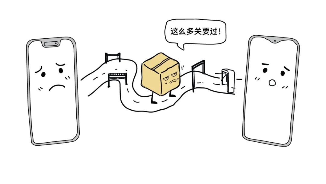 简单来说,两人收发图片/文件必须通过“传话人”完成。过程环节多、距离远,自然耗时又耗资源。