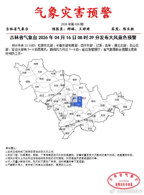 预计未来12小时,松原东北部、长春东部和南部、四平东部、辽源、吉林、通化北部、白山北部、延边大部将出现5~6级西南风,瞬间风力可达7~8级。省应急管理厅、省气象局联合提醒公众注意做好防范工作。