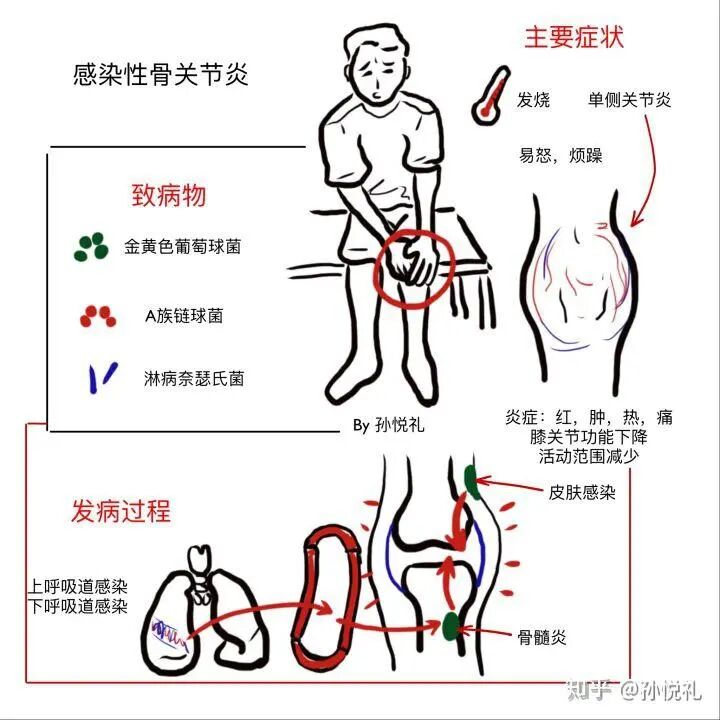 感染性骨关节炎的典型表现:关节剧烈疼痛、红肿、发热、活动受限。对照关羽的“右臂青肿”,几乎完全对应。
