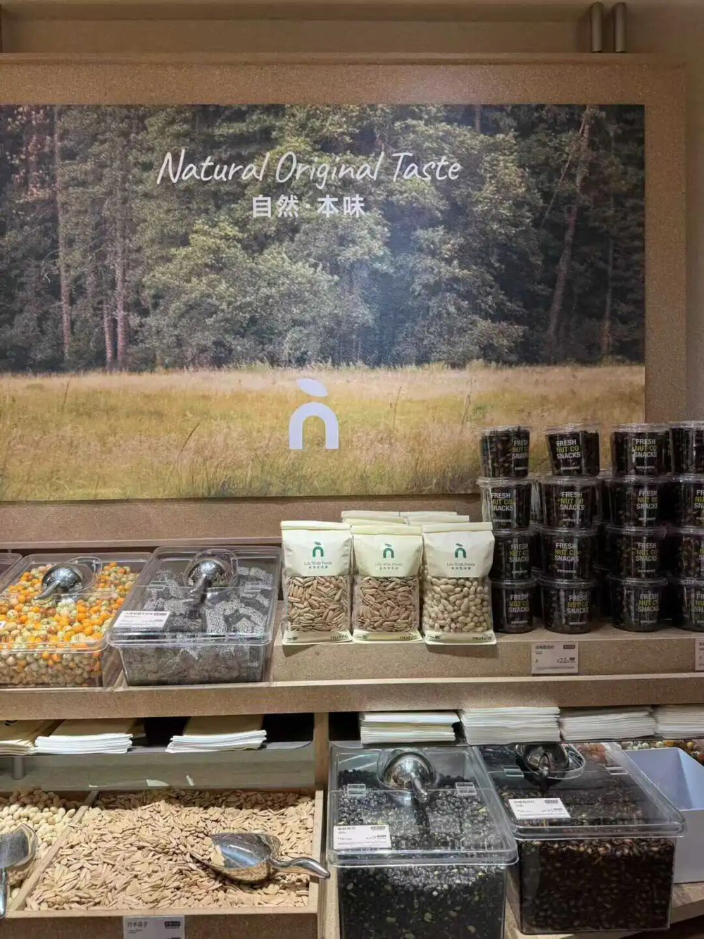 整体空间强调自然气息,大量运用原木色货架、大地色装饰,点缀绿植与暖色灯光。大幅广告牌不展示产品信息,而是呈现山野景象,配以“自然本味”的文案,将新鲜零食与自然原料、干净配料建立起更具画面感的联想。