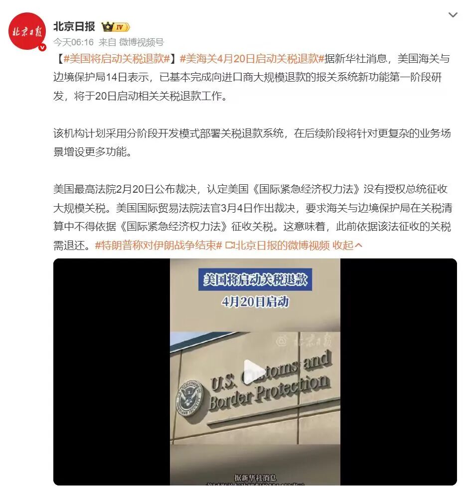 美国海关与边境保护局近日宣布,自4月20日起正式启动关税退款申请。