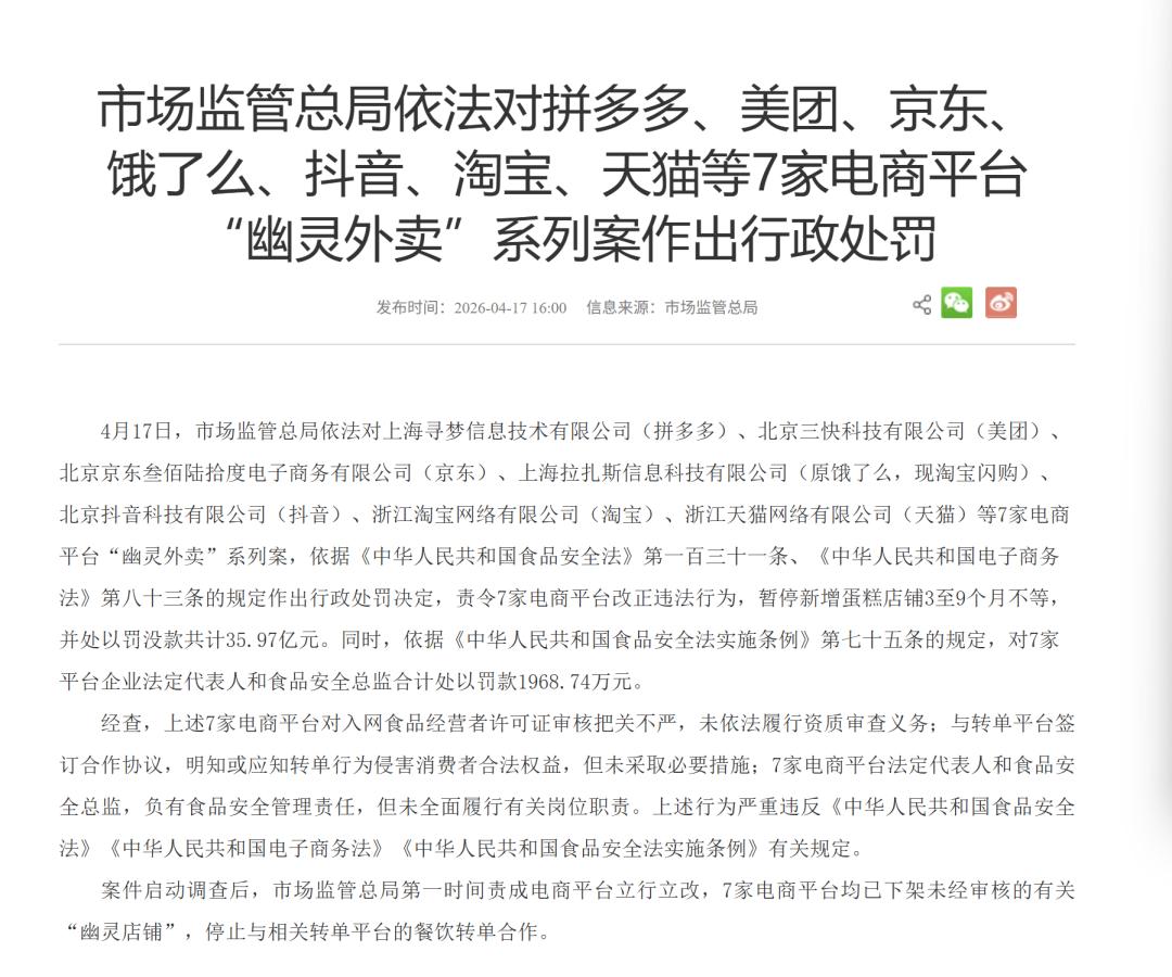 4月17日,市场监管总局针对拼多多、美团、京东、淘宝闪购(原饿了么)、抖音、淘宝、天猫这7家平台的“幽灵外卖”系列案件作出行政处罚决定:要求各平台立即改正违法行为,暂停新增蛋糕店铺3至9个月,并对7家平台合计处以罚没款35.97亿元;同时,对这些平台的法定代表人和食品安全总监共罚款1968.74万元。