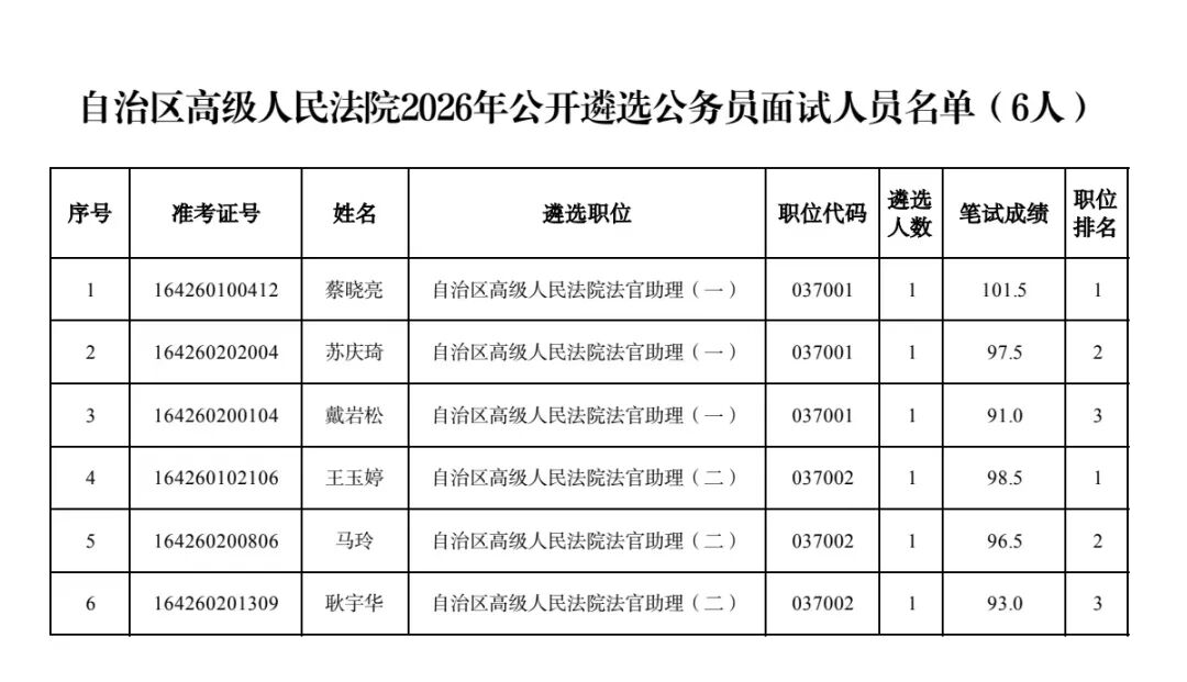 具体可查看自治区高级人民法院2026年公开遴选公务员面试人员名单。