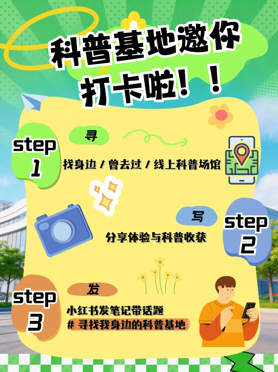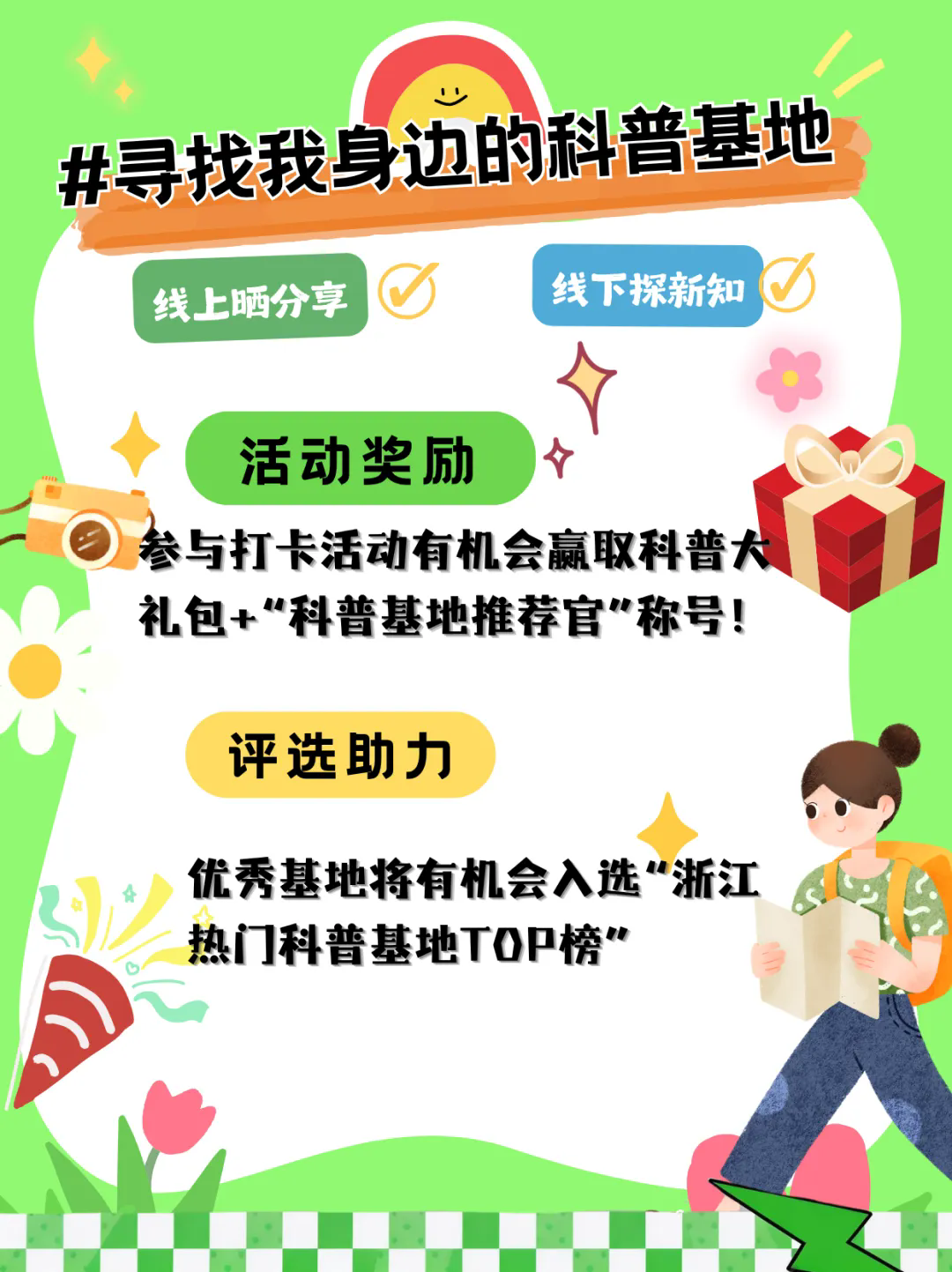 ✅ 探访 ✅ 拍照 ✅ 分享赢科普大礼包 + “科普基地推荐官”称号