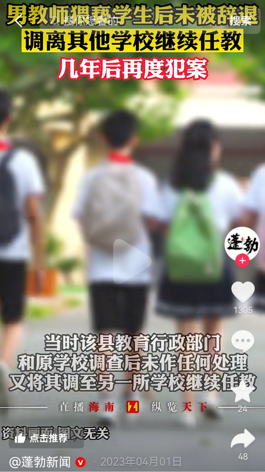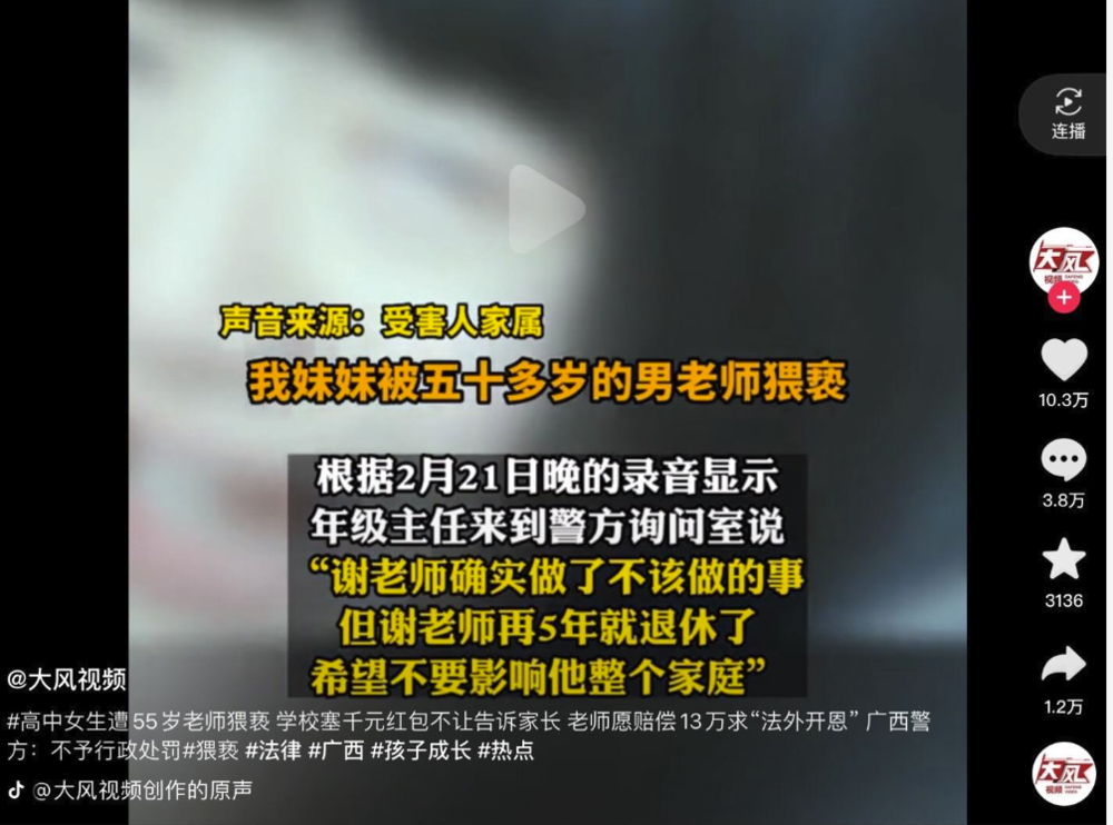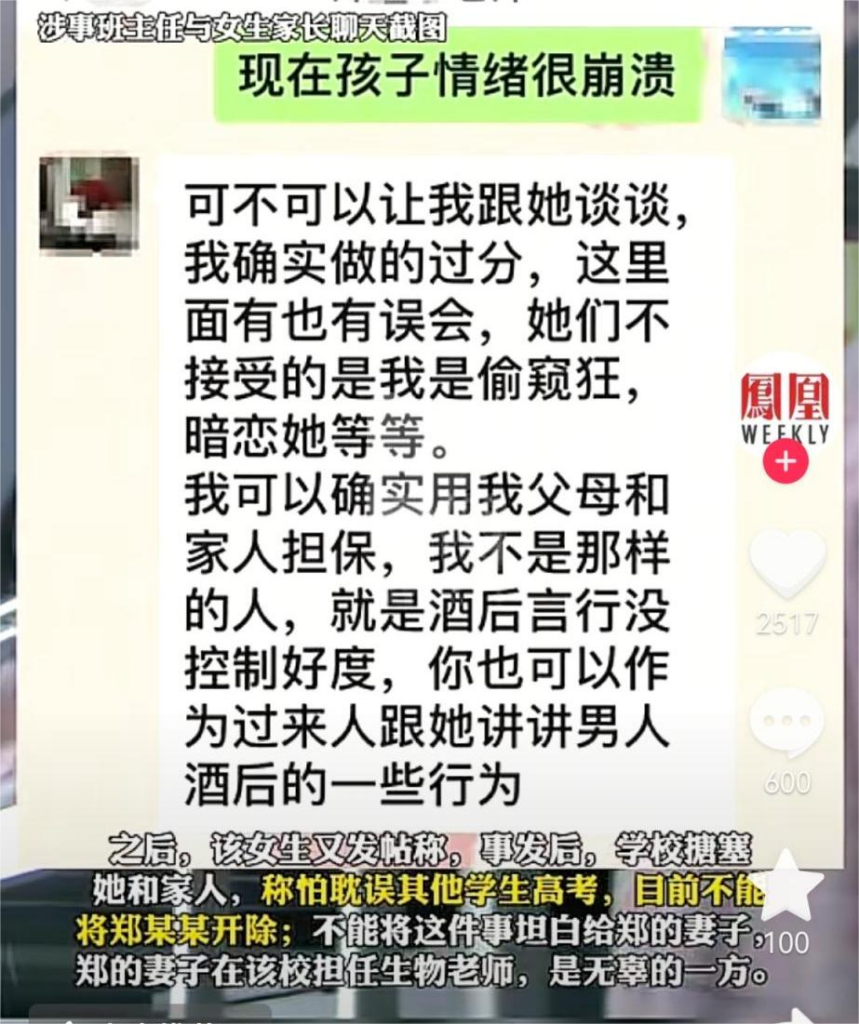类似案例并非个例:2023年,52岁班主任酒后查寝猥亵17岁女生,被行拘10天却未被开除,学校理由是“怕耽误学生高考”;同年,50多岁体育老师骗高二女生到楼梯间猥亵,家属曾试图赔钱和解,年级主任也为其求情,后因舆论压力才被拘留、吊销教师资格。这些案例中,总有第三人劝受害方“别闹大”,仿佛受害学生成了过错方。