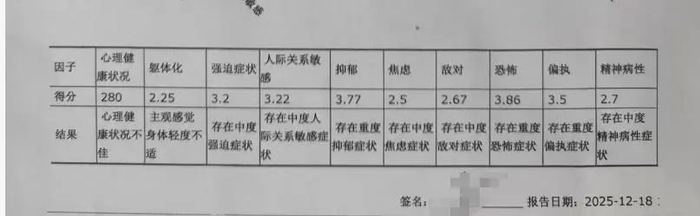 一个月后,小周去医院检查,结果显示她存在重度抑郁、中度焦虑、中度敌对、重度恐怖、重度偏执、中度精神病性等多种症状。又过了一个月,情绪低落的小周吃下10粒阿莫西林,幸好同学及时发现并送医洗胃,才保住性命。