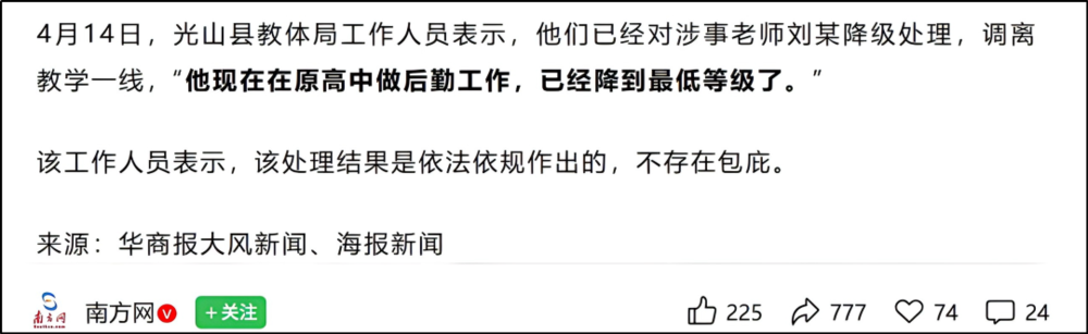 另一边,被释放的老刘竟顺利回到学校,只是被调离教学岗位,转做后勤工作。当地教体局工作人员称这已是“降到最低等级”的处理。