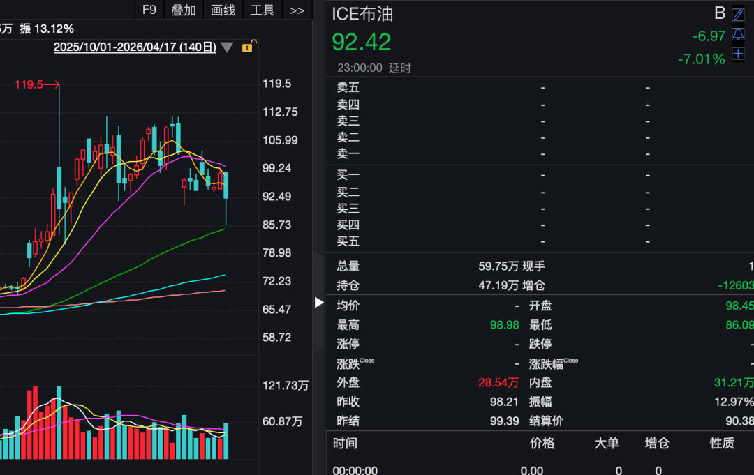 国际基准布伦特原油期货下跌7.01%,收于每桶92.42美元。