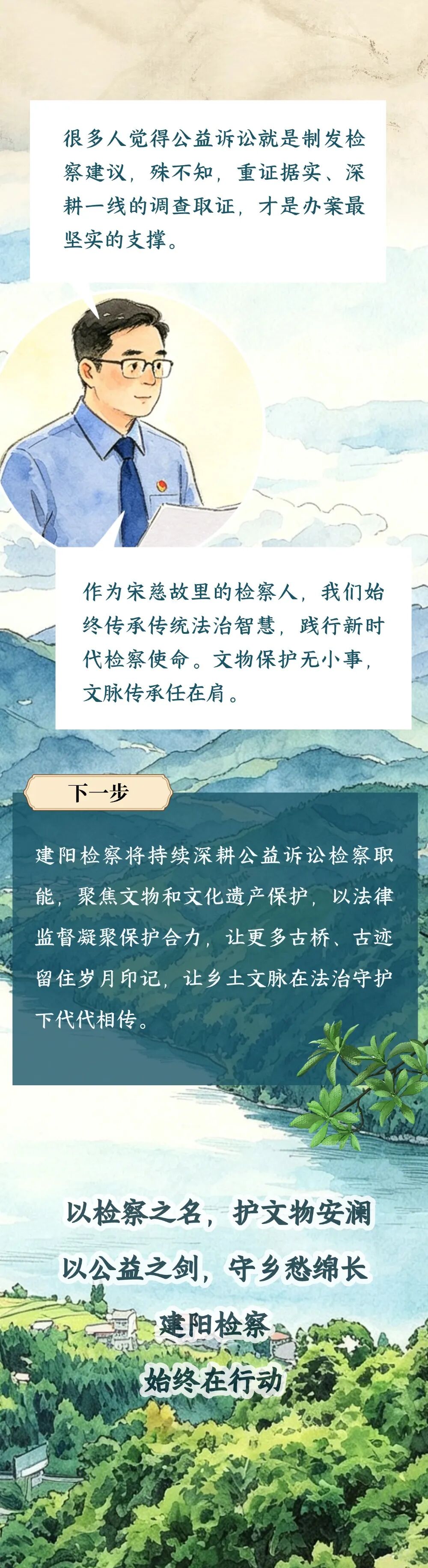 面对问题,检察官联合文旅部门、文物保护员现场分析,反复沟通核实,彻底找出古桥隐患根源;仔细梳理权责清单,明确各方管护范围,为后续精准监督筑牢基础,确保每一处隐患都能追溯、整改并落实。