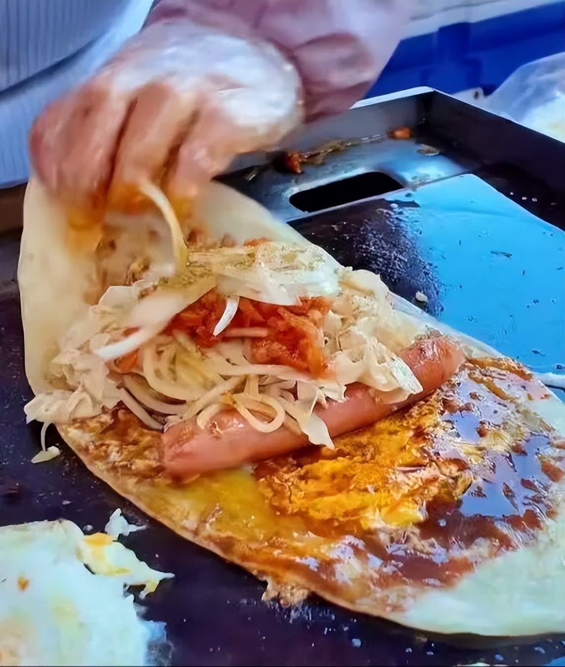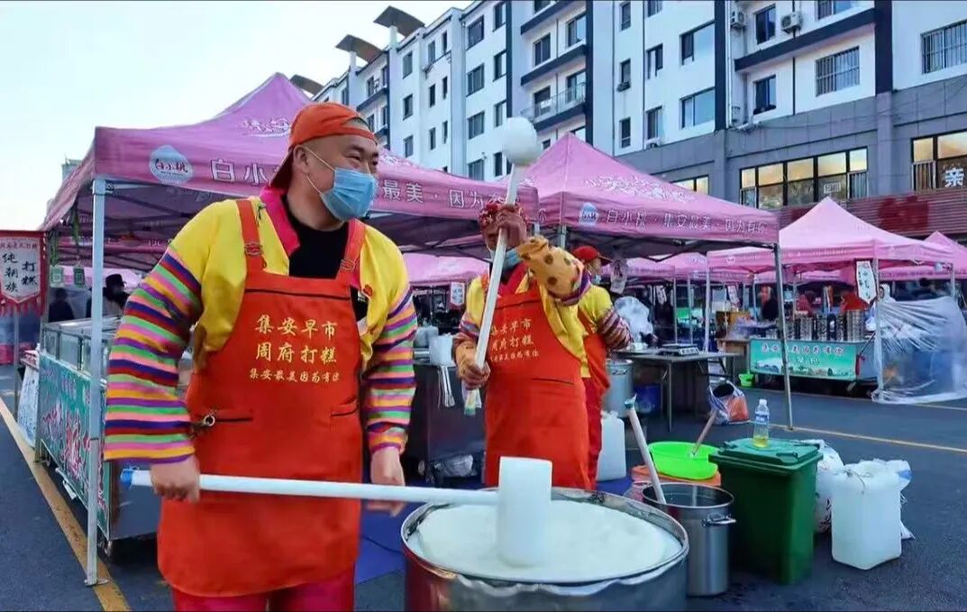 热气最能驱散春寒。早餐摊前,香气直钻鼻腔。金黄酸汤子顺着工具滑入沸水,捞起浇上鲜爽汤汁,酸辣开胃,一口暖至心底。师傅挥槌敲打糯米,打出的打糕软糯弹牙,裹上豆面,甜香在舌尖化开。奶白羊汤经慢火熬煮,不腥不膻,搭配刚出炉的烧饼,是抵御东北晨凉的绝佳美味。还有油条、豆浆、朝鲜族米肠、集安特色鸡蛋饼,每一口都是地道的集安风味。
