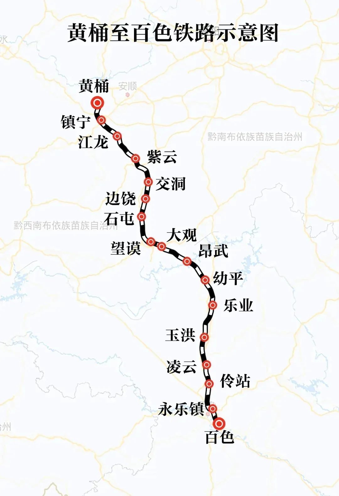 黄百铁路起自贵州省安顺市普定县黄桶站,途经贵州省安顺市镇宁布依族苗族自治县、紫云苗族布依族自治县,黔西南布依族苗族自治州望谟县,以及广西壮族自治区百色市乐业县、凌云县,最终接入广西百色站。项目建成后,将进一步完善区域路网布局,成为贵州西南地区通往广西北部湾地区的便捷通道,对加快西部陆海新通道建设、推动区域经济社会协调发展具有重要意义。