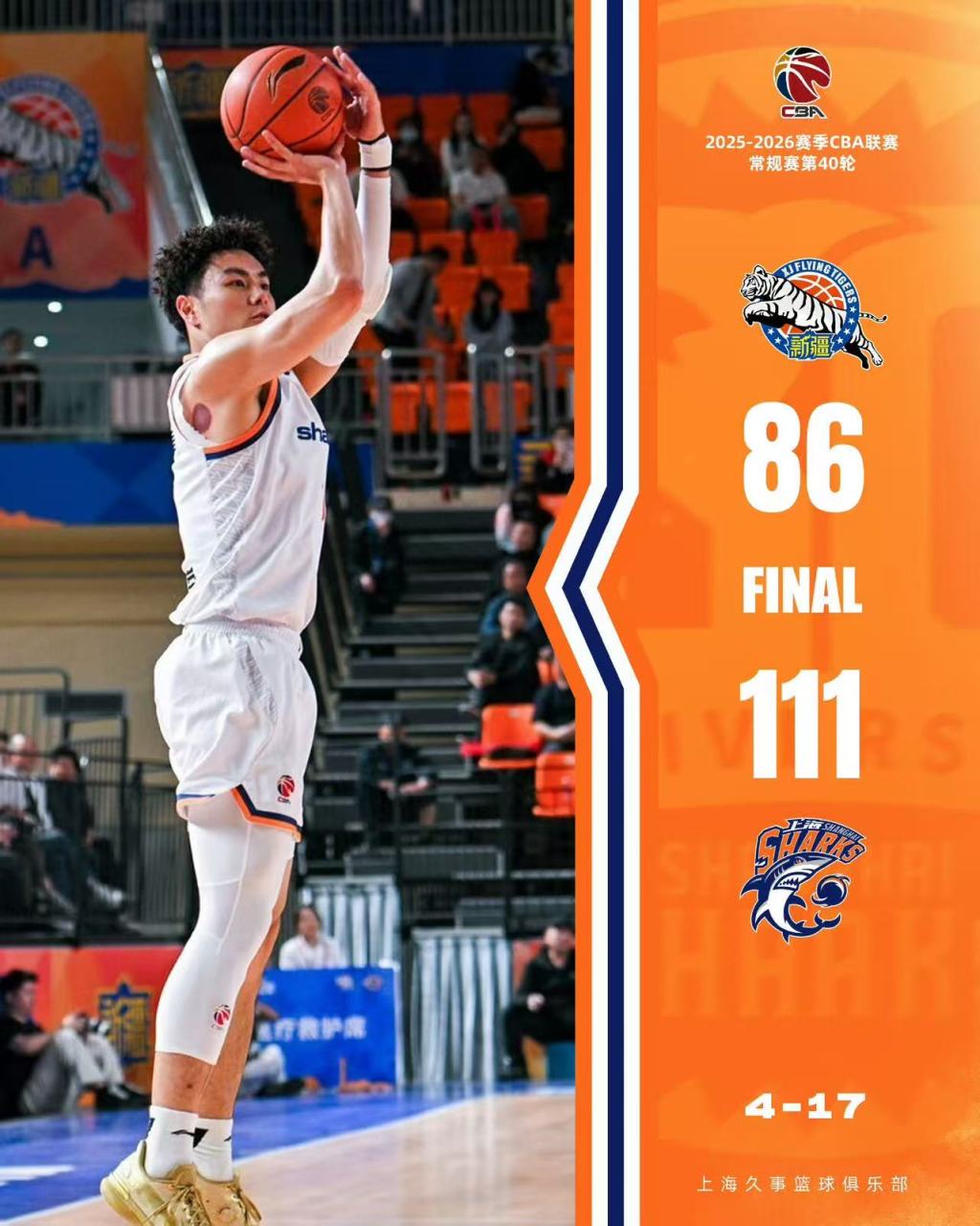 北京时间4月17日晚,CBA第40轮,上海男篮客场111-86击败新疆,将连胜纪录扩大至21场。首节上海一波15-5攻势确立领先,新疆一度追至6分;次节因球场漏水中断超一小时,重启后新疆追至4分,但上海再送11-4攻势,半场48-38领先10分。下半场上海始终保持10分以上优势,末节13-2攻势将分差拉至26分锁定胜局。古德温21分4篮板11助攻,张镇麟12分6助攻3抢断,王哲林12分7篮板,两人正负值均为+21。主帅卢伟表示:“天气原因导致比赛中断,双方状态受影响,以健康完赛为主。”