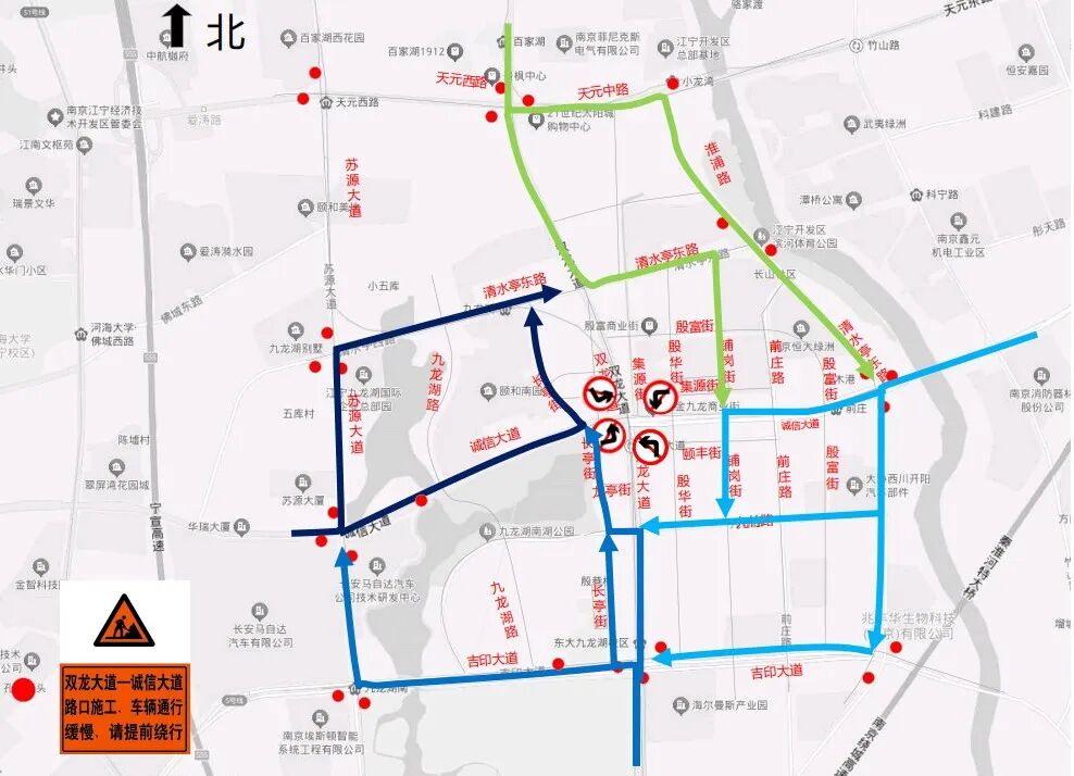 施工期间,双龙大道—诚信大道路口禁止左转,直行与右转车辆可正常通行。为降低通行影响,建议过往车辆提前规划路线,选择合适路径绕行: