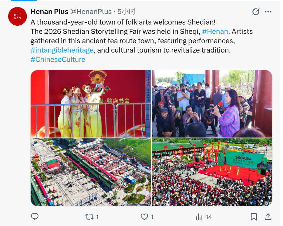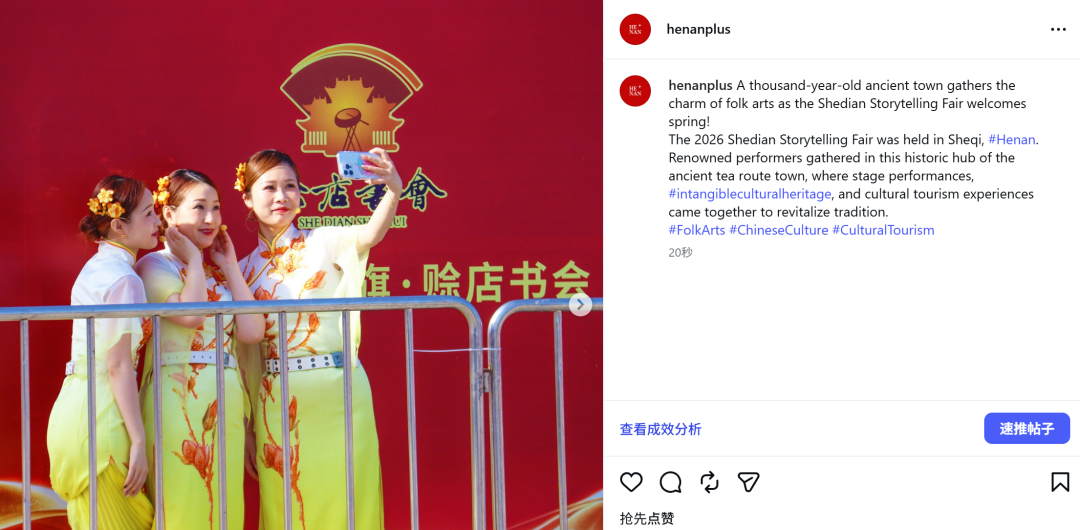4月21日,国际在线河南频道通过英语在Facebook、Twitter、ins三大平台对赊店书会展开推介。