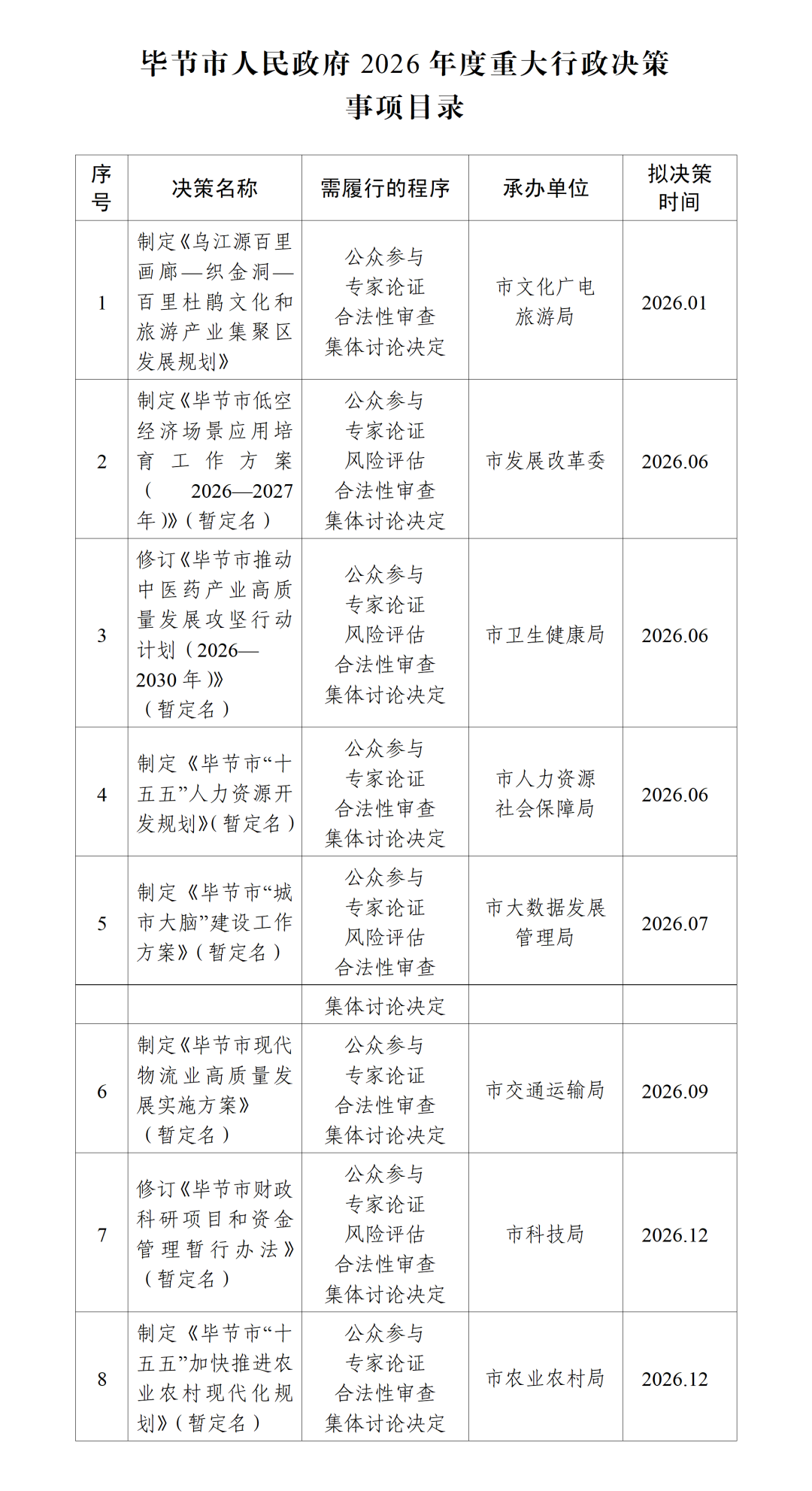 原标题:《毕节市2026年度重大行政决策事项发布!》