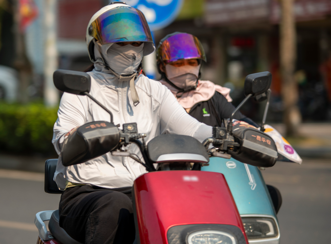 △近日,海南琼海市民“全副武装”应对高温。