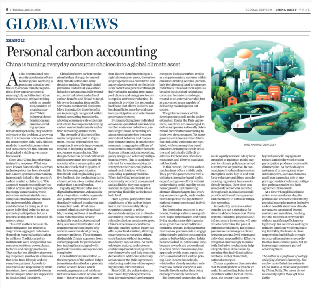 近日,北京师范大学生命科学学院张立教授在《中国日报》(China Daily)“Global Views”版面发表了题为“Personal carbon accounting: China is turning everyday consumer choices into a global climate asset”的智库文章,深入剖析了中国碳普惠机制在促进消费端减排、优化气候治理体系方面的创新举措及其全球价值。