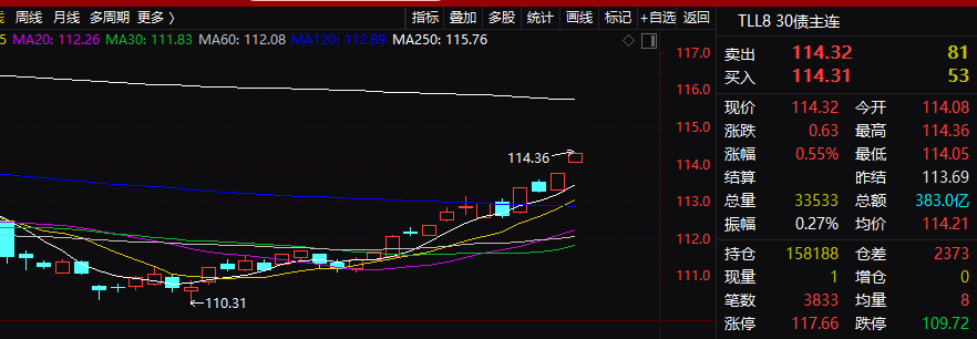 近期长债市场呈现出明显的趋势性行情,今日早盘30年期主力合约延续涨势,一度上涨0.55%至114.32元,刷新2025年12月3日以来的高点。