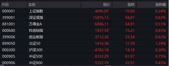 截至4月22日上午收盘,A股主要指数均实现上涨:上证指数上涨0.24%,深证成指上涨0.63%,创业板指上涨0.63%,科创综指上涨0.83%。