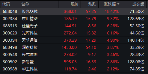 个股方面,长光华芯涨幅超18%,盘中一度触及20%涨停,股价创历史新高;东山精密涨幅超9%,同样在盘中刷新历史纪录;仕佳光子、光库科技也均大幅上涨,股价纷纷创下历史新高。