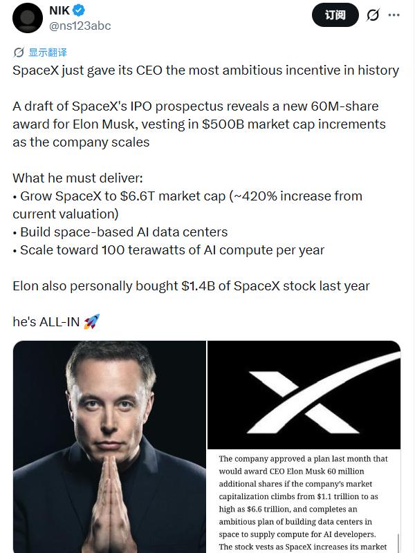 根据The Information获取的招股文件,SpaceX董事会上个月批准了一项计划:若公司市值从1.1万亿美元升至6.6万亿美元,且完成太空数据中心建设计划,马斯克将额外获得6000万股股票。随着市值每增加5000亿美元,这些股票会分批归属。