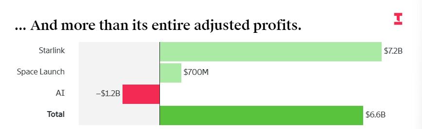 但问题在于,这笔钱远不足以填补另外两个部门的亏空。火箭发射业务按同样口径计算的自由现金流为负30亿美元,人工智能业务更是一年烧掉近140亿美元现金。三项业务合计,SpaceX整体的自由现金流为负140亿美元。