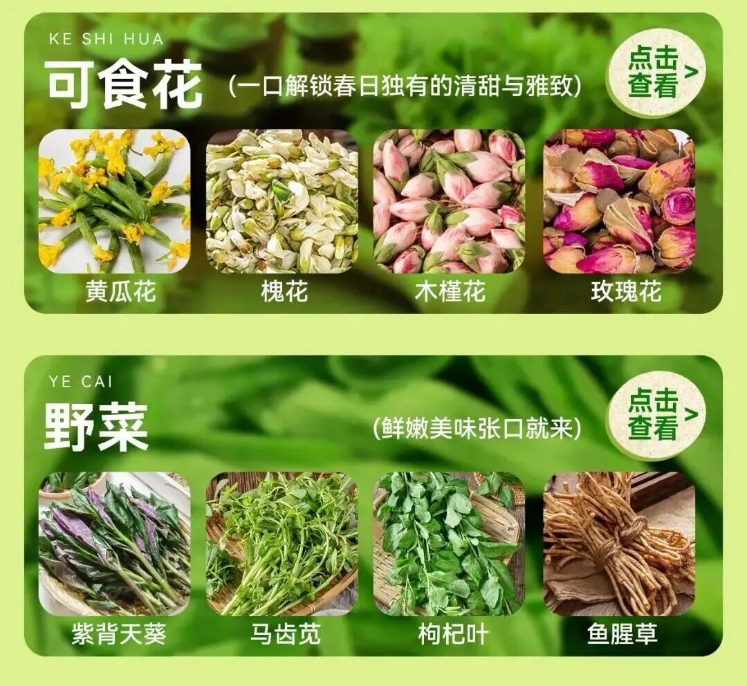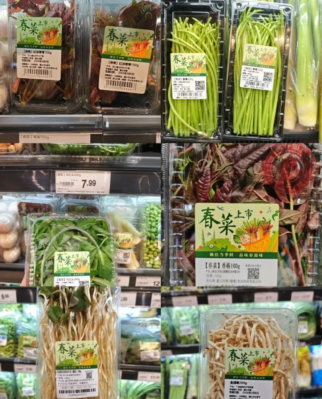 从传统野菜到可食用花卉,从山野嫩芽到药食同源的植物,各家零售商几乎都通过不同方式,把“春天”搬进了自家卖场。