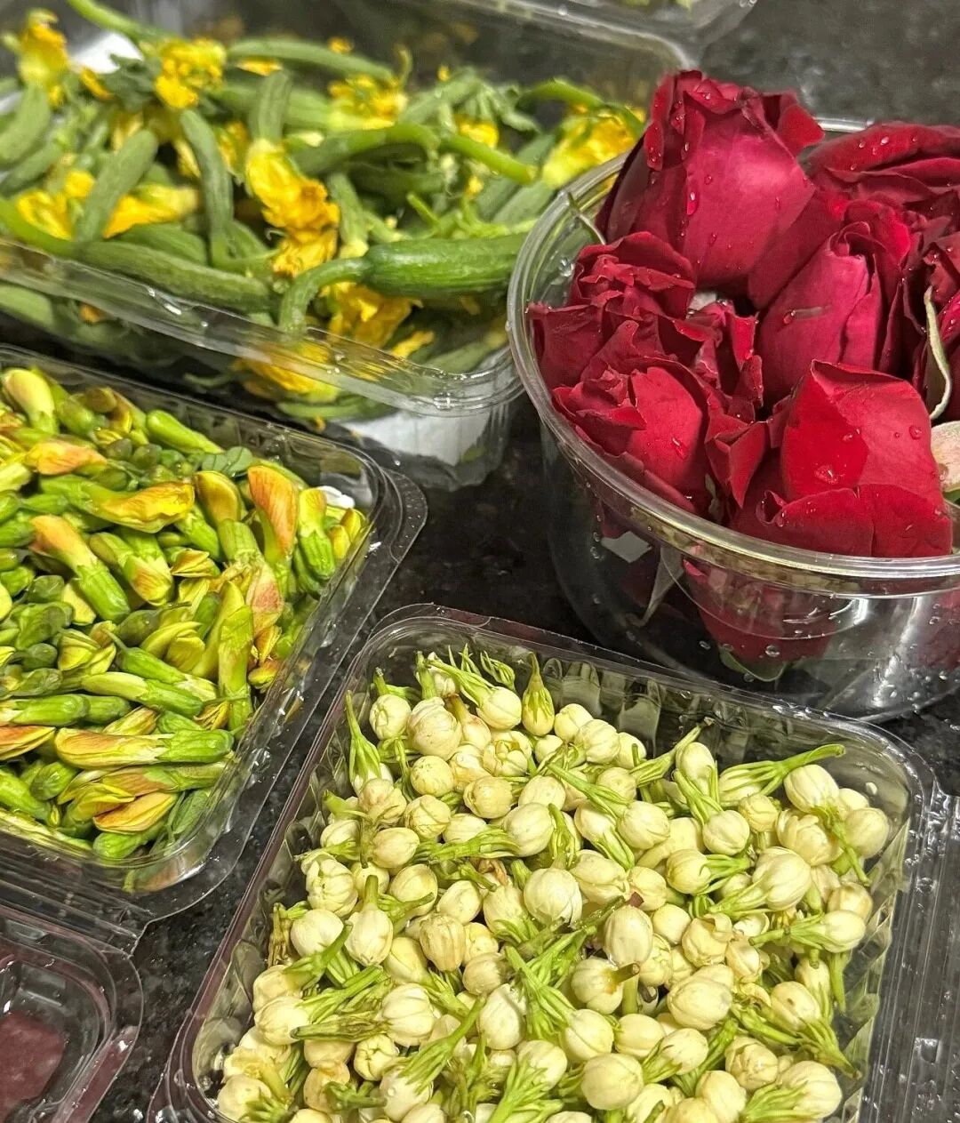 盒马今年的春菜清单堪称“植物图鉴”:鲜食玫瑰花、茉莉花、地衣、板蓝根青菜、大理海菜(金雀花)、枸杞芽、丝瓜尖……