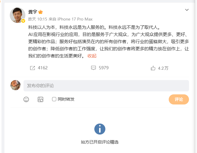 舆论风波后,龚宇连发三条微博,大意是AI剧并非取代人,而是服务人。不过目前,这三条微博已开启评论精选。