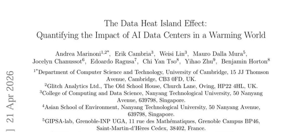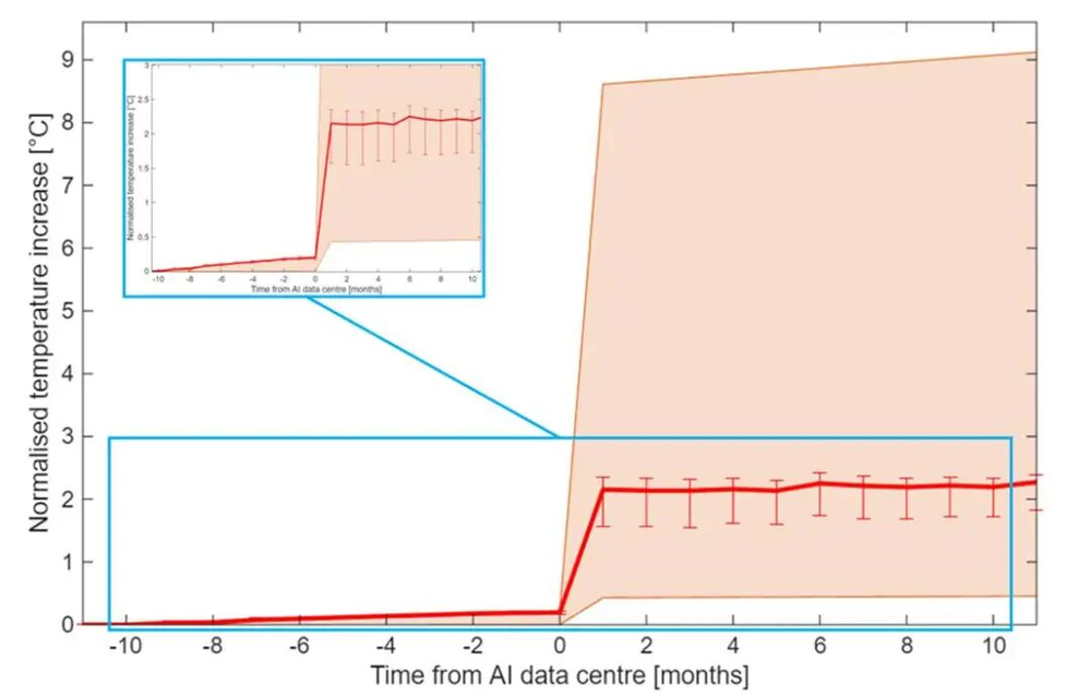 近期,由剑桥大学牵头,联合欧洲与亚洲多所高校研究人员开展的一项研究表明,AI数据中心投运后,周边地表温度平均上升约2℃,影响范围可延伸至10公里左右。这项跨计算机科学、地球科学与环境科学领域的研究,目前还处于未经同行评议的预印本阶段。