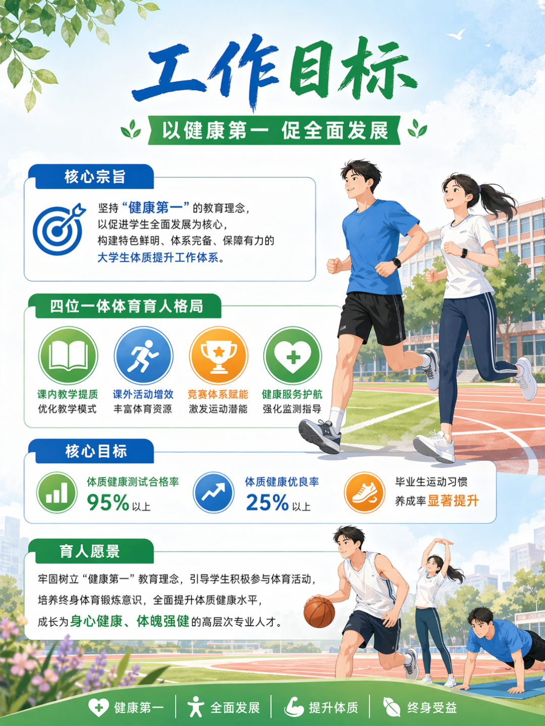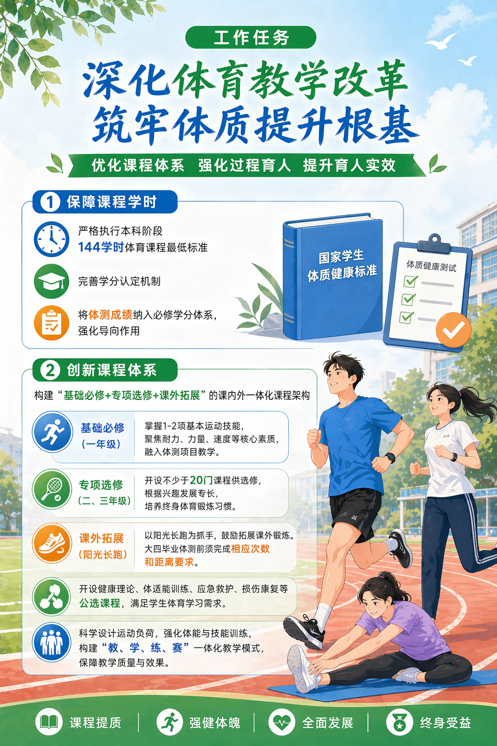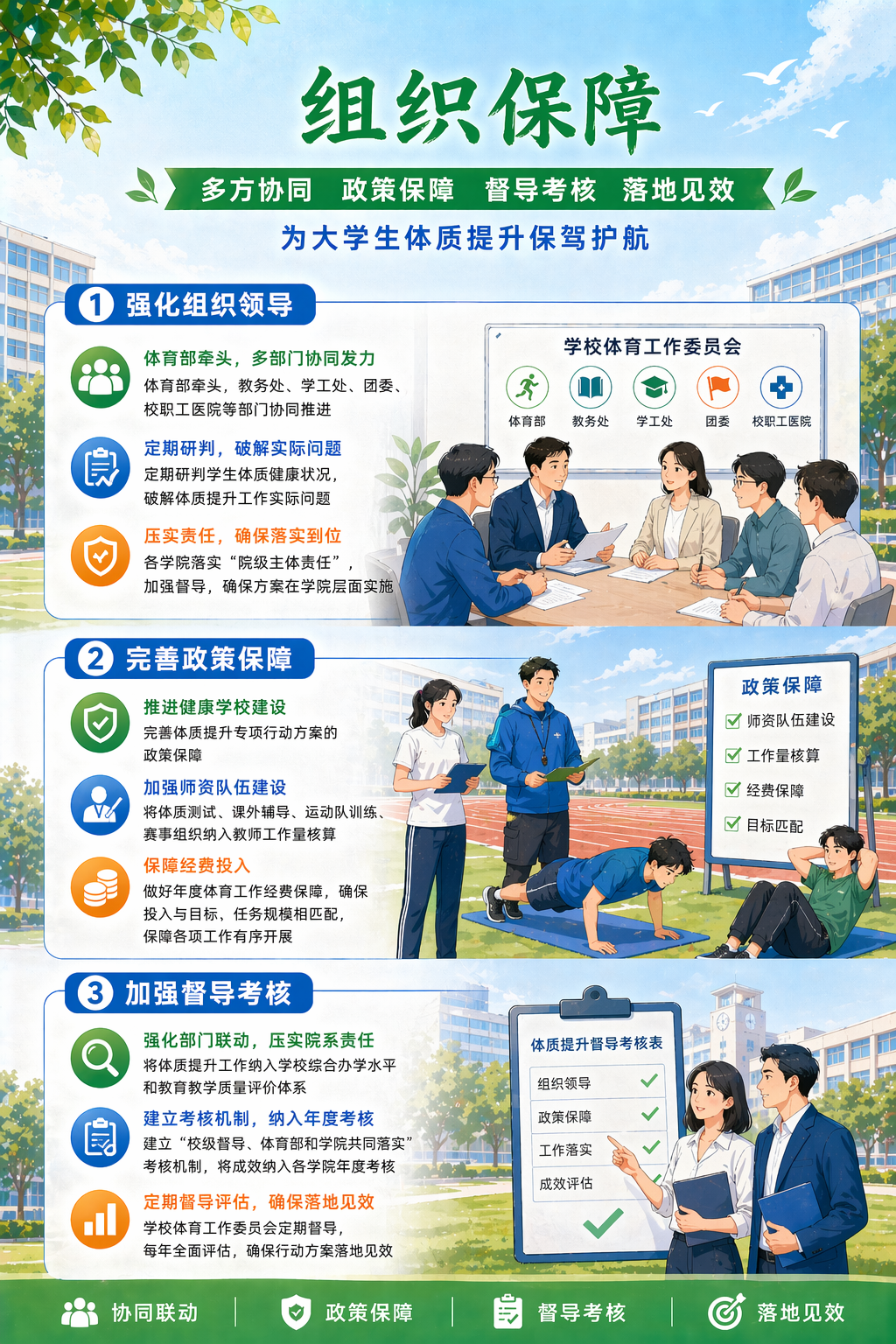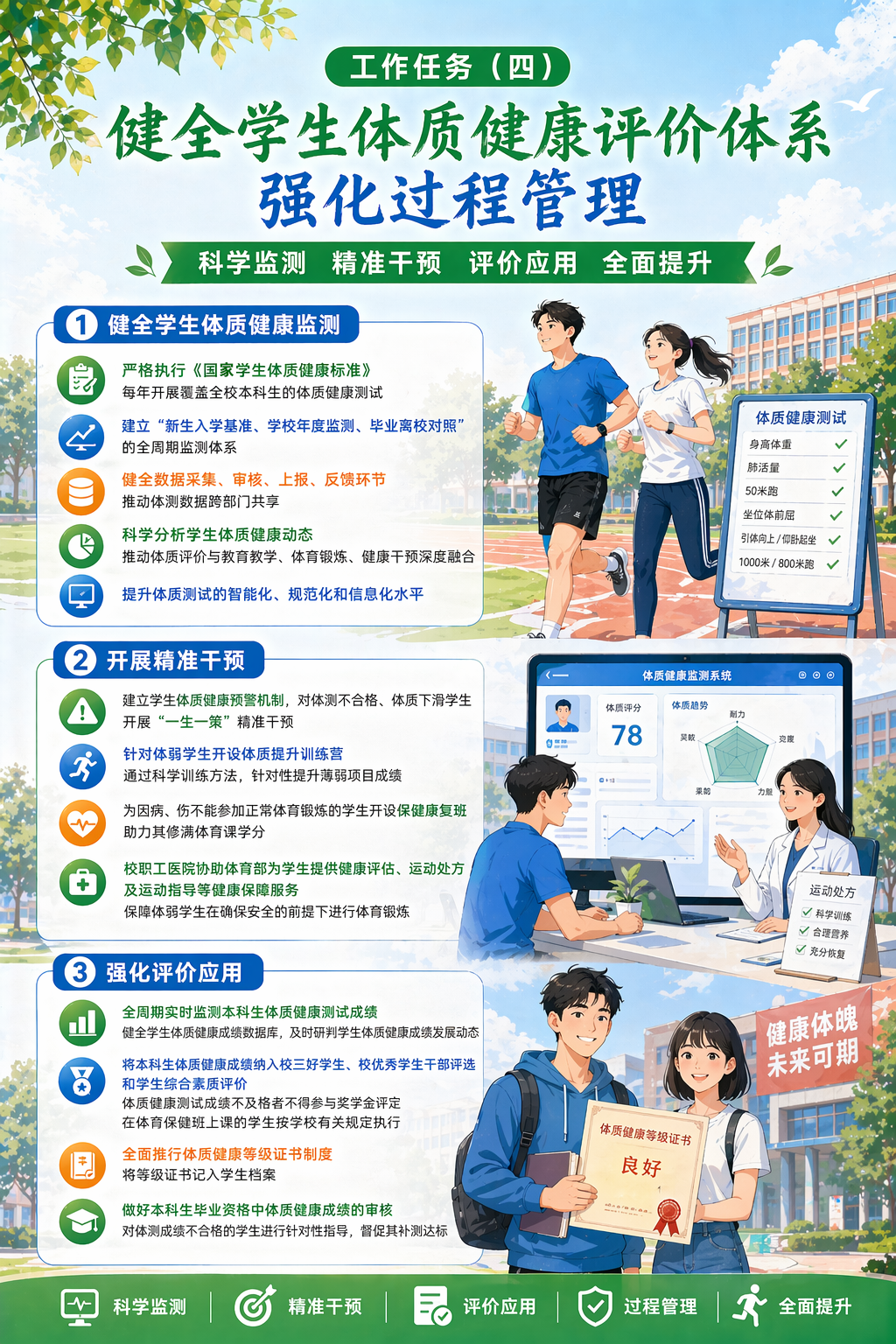 为深入落实《教育强国建设规划纲要(2024—2035年)》,依据教育部等相关部门要求,江苏大学结合自身办学实际,围绕学生体质健康问题,在完成学生体质健康工作的全面摸底排查与成效总结后,制定了《江苏大学大学生体质提升专项行动方案》,旨在通过更高标准与更扎实的举措,推动学生体质健康水平进一步提升。