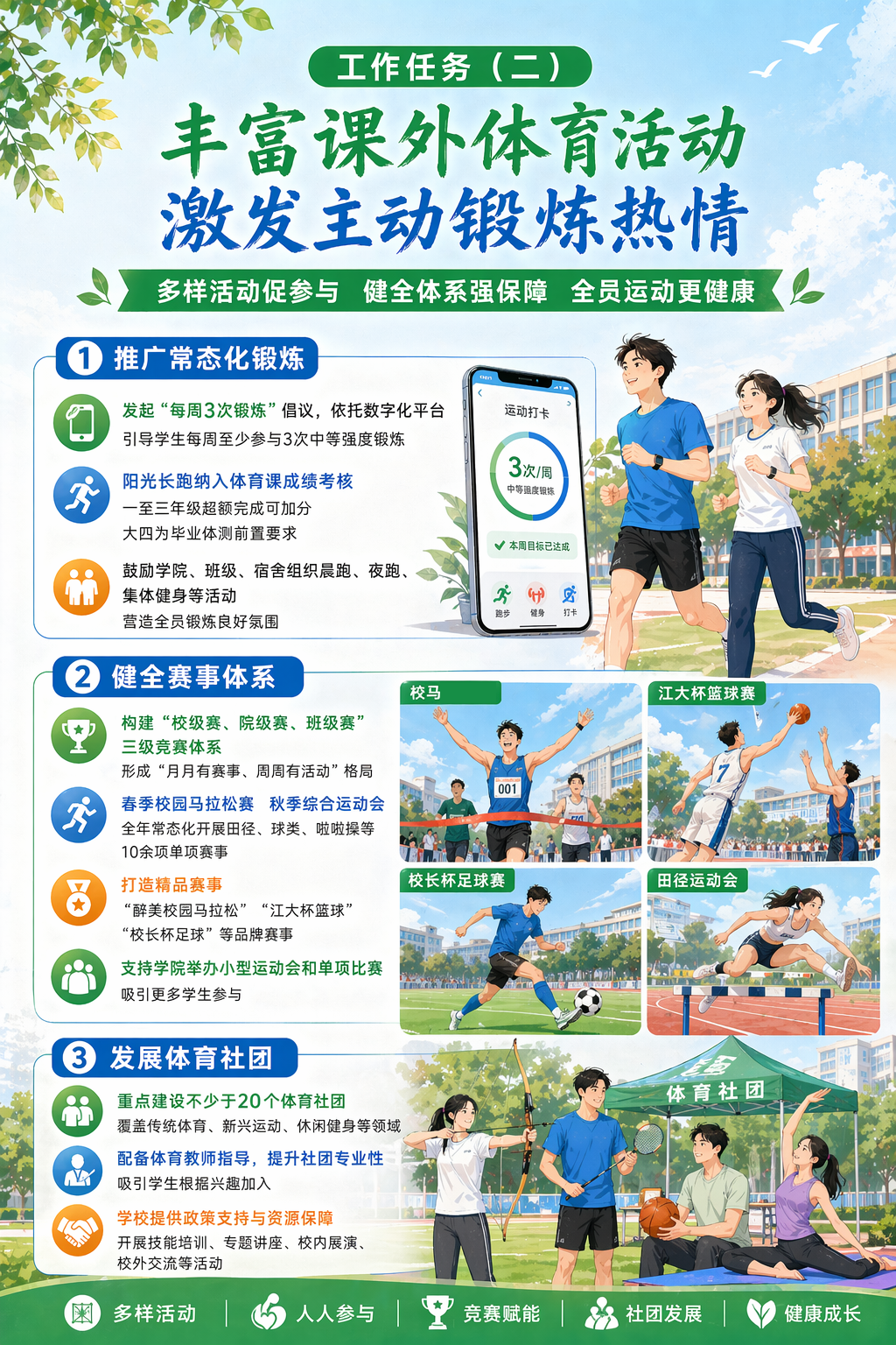 体质是青春的底色,健康是奋斗的基石。让我们积极行动起来,在运动中锤炼意志、焕发活力,为终身发展与幸福人生夯实健康基础,为教育强国、体育强国、健康中国建设贡献江大力量。