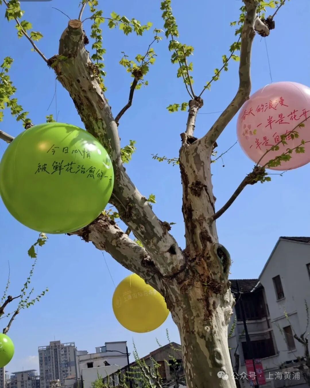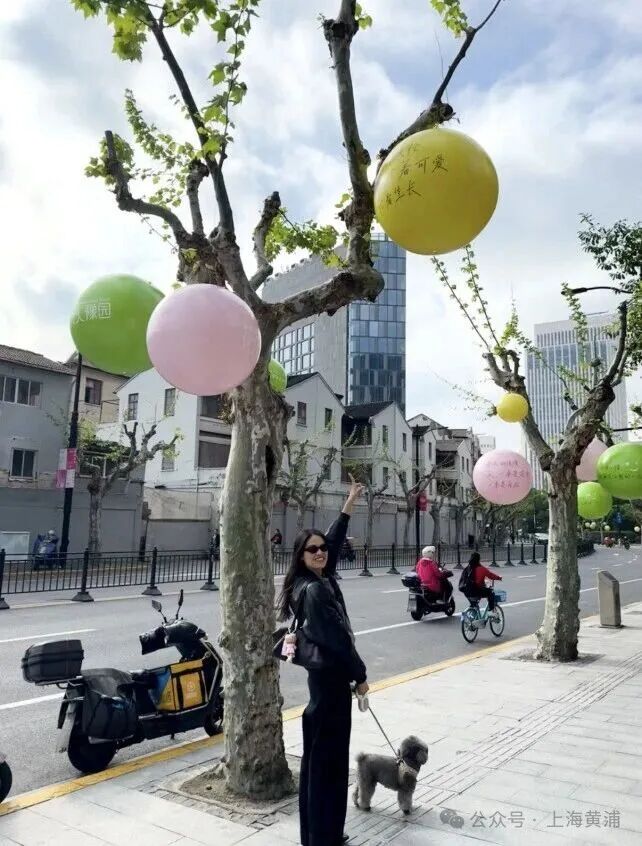 来往行人纷纷驻足,用手机定格这帧春日限定画面。阳光穿过梧桐新叶,洒在气球上,也落在老建筑幕墙上,老城厢的烟火气与春日浪漫在此刻完美交融