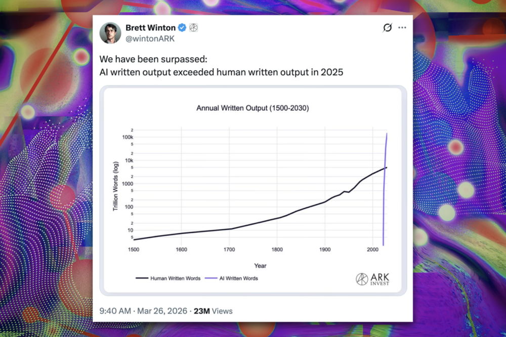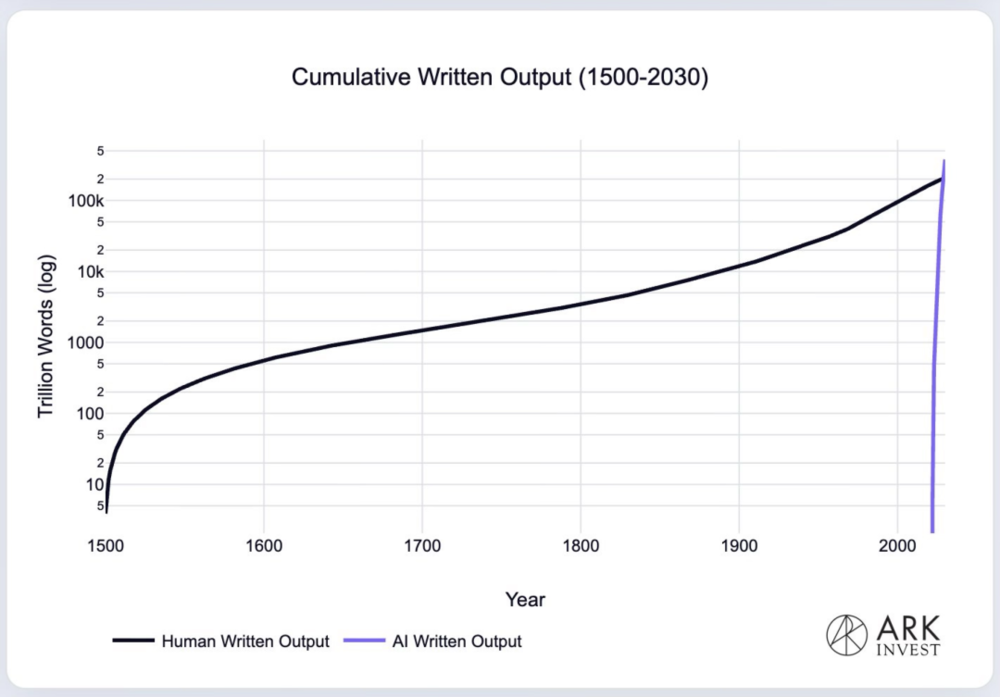 Winton还做出更大胆预测:到2020年代末,AI的“累计”文字产量(含所有备忘录、白皮书、商业文档、社交动态)将彻底超过人类自有文明以来的文字总和。