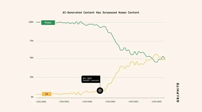 2024年11月,AI生成的网络文章数量首次超过人类手写文章;2025年中期,新增网页中AI生成内容占比已逼近甚至超过50%。