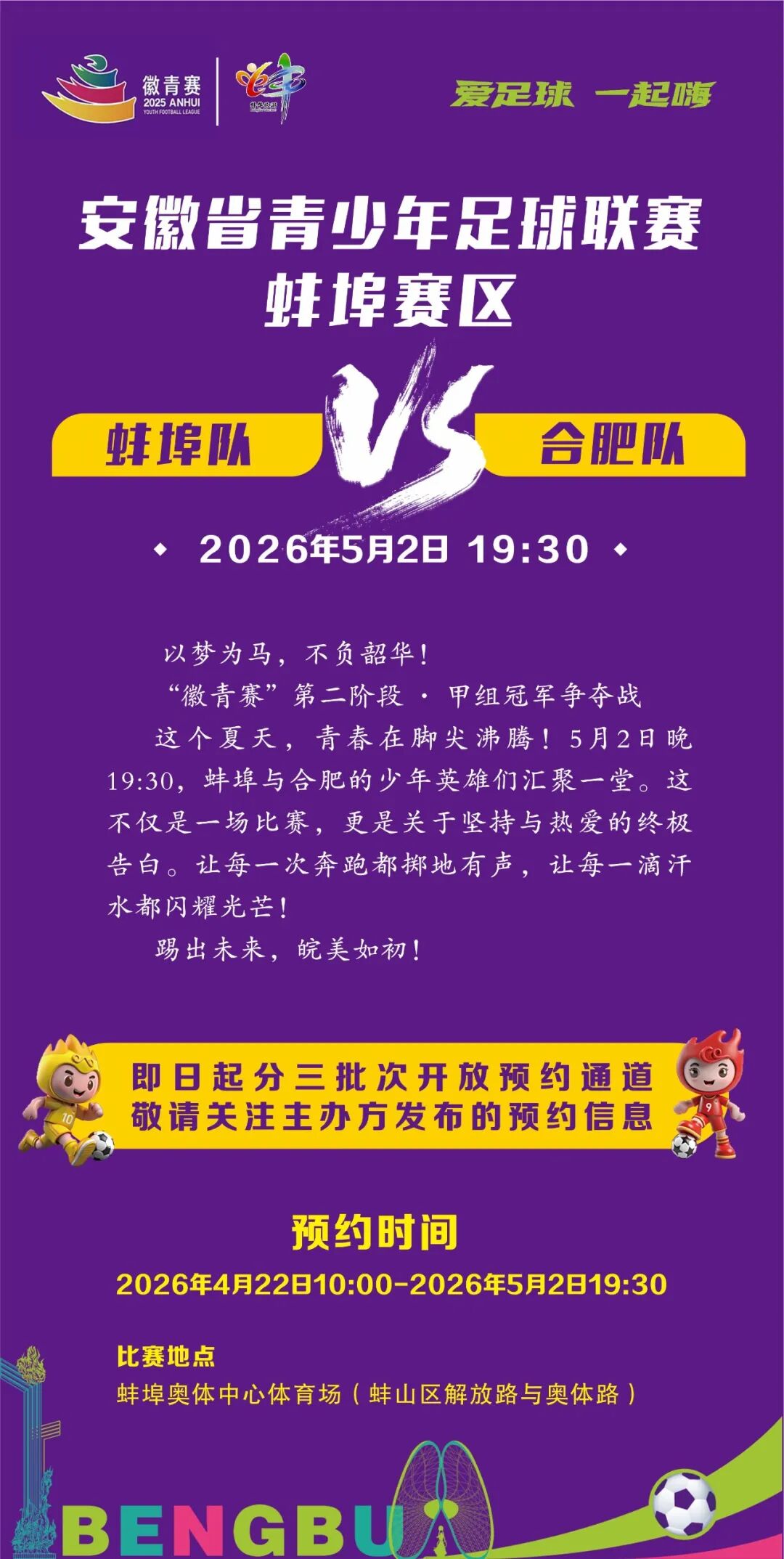 5月2日19:30,“徽青赛”甲组冠军争夺战将热血开赛,对阵双方是蚌埠队与合肥队,这是一场关于热爱与梦想的对决,诚邀大家共同见证。