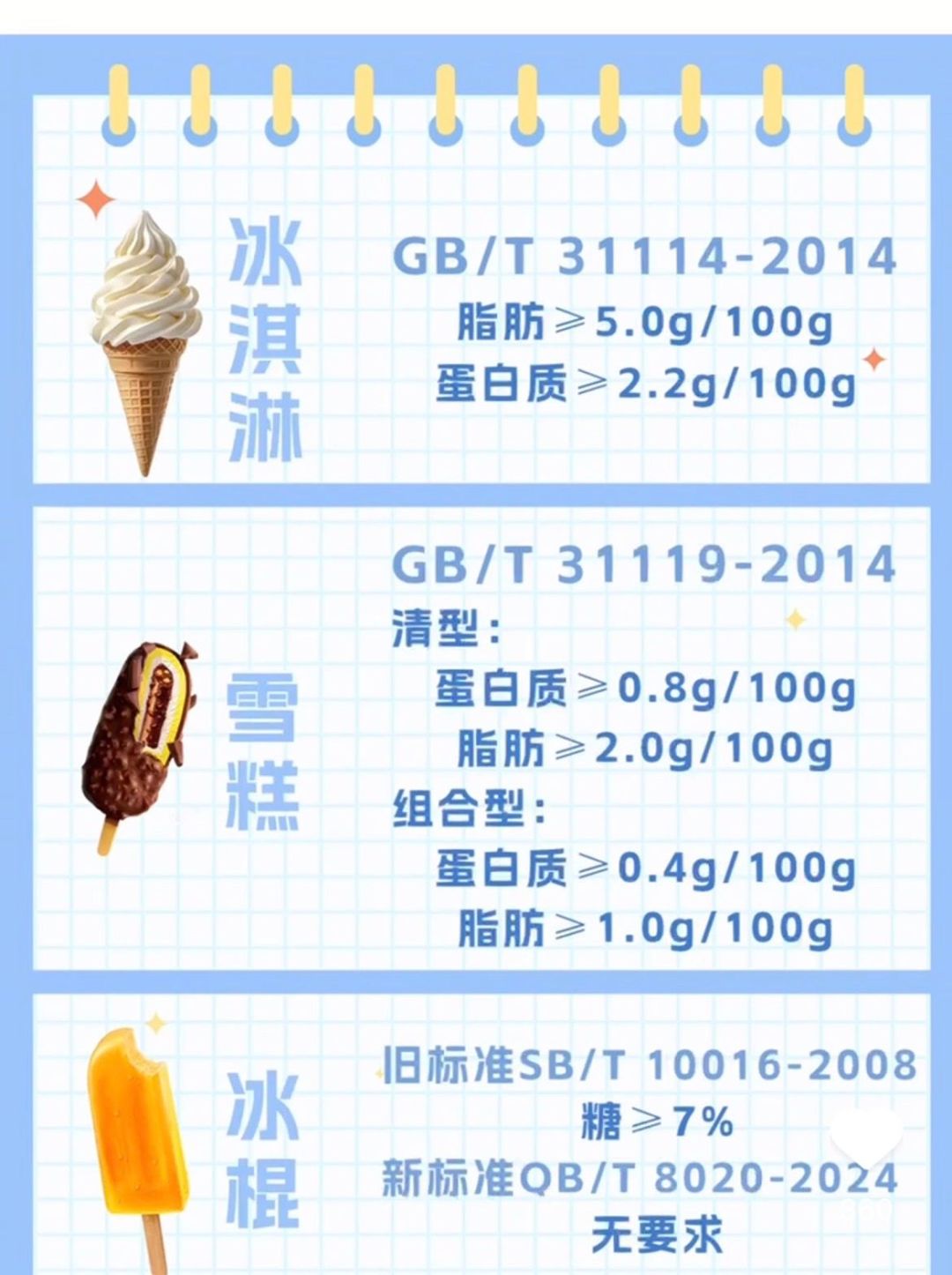 她介绍,《冷冻饮品 冰淇淋》(GB/T 31114-2014)要求冰淇淋每100克中蛋白质含量≥2.2克、脂肪含量≥5克;《冷冻饮品 雪糕》(GB/T 31119-2014)中,清型雪糕每100克蛋白质≥0.8克、脂肪≥2克,添加巧克力等辅料的组合型雪糕每100克蛋白质≥0.4克、脂肪≥1克;冰棍主要原料是饮用水、食糖等,此前标准要求总糖(以蔗糖计)≥产品重量的7%,而去年10月1日起实施的《冷冻饮品 冰棍》(QB/T 8020-2024)不再对总糖含量做要求。“大家可以对照标准,查看营养成分表来区分。”周睿清说。