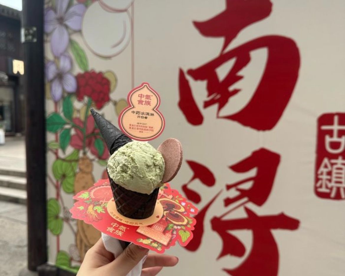 更有趣的是,中医元素也融入了冰淇淋。“我平时很少吃冰淇淋,但看到加了中药,就好奇想试试。”市民周曦说,不久前她和朋友逛南浔古镇时,在一家“中气食族”店铺尝试了中药冰淇淋。她介绍,配料表有猴头菇、薏仁、山药、黄芪、甘草等,但吃起来没有预想的中药苦涩味,小朋友也能吃完。