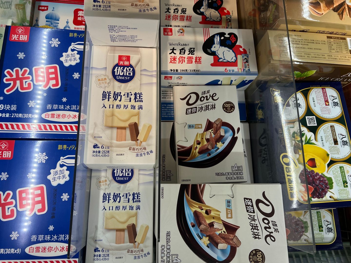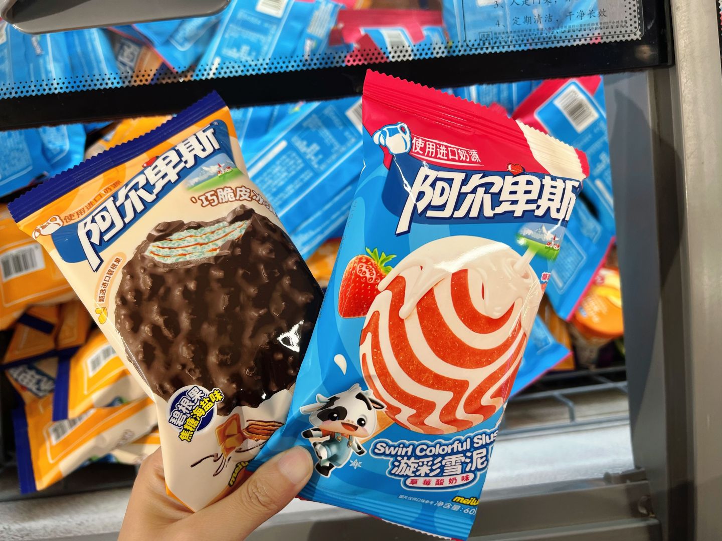 除了景区,品牌跨界也让冷饮“出镜率”大幅提升。在湖城爱山广场的盒马鲜生,记者看到冰柜里有COSTA咖啡、奥利奥、脆脆鲨、光明优倍等原本主打饼干、牛奶、咖啡的品牌推出的特色冷饮,吸引不少市民选购。此外,记者走访湖城部分冷饮批发店和商超发现,阿尔卑斯、m豆、不二家等熟悉的糖果品牌,也推出了多款冰淇淋产品。