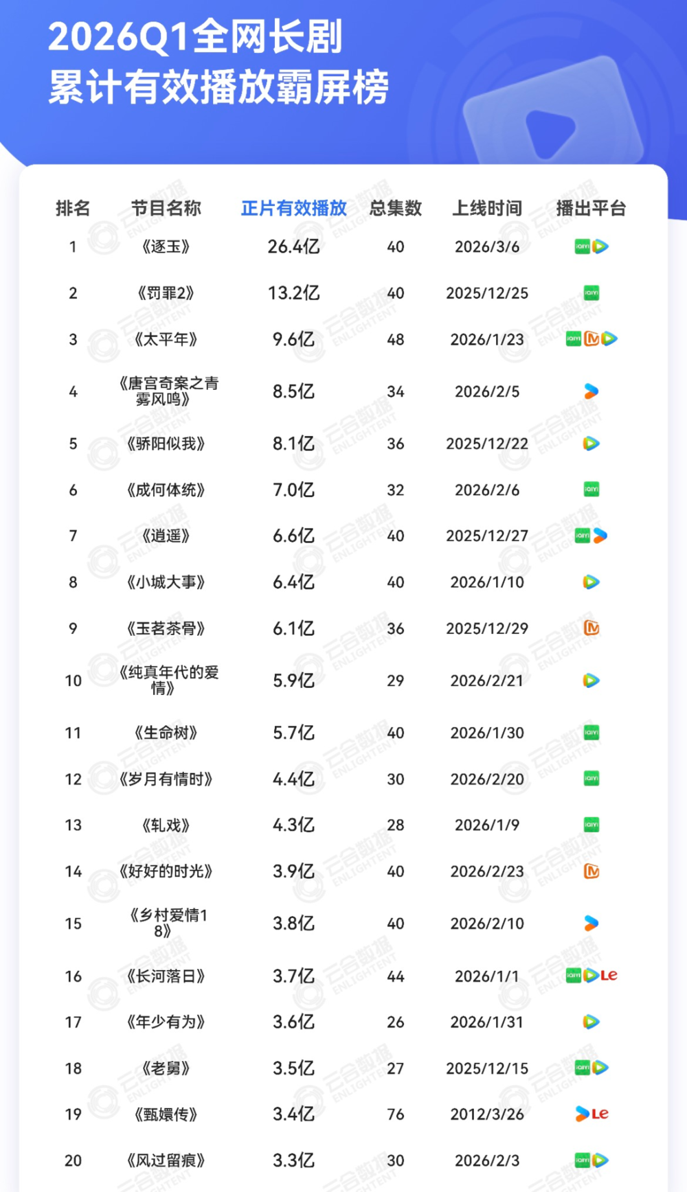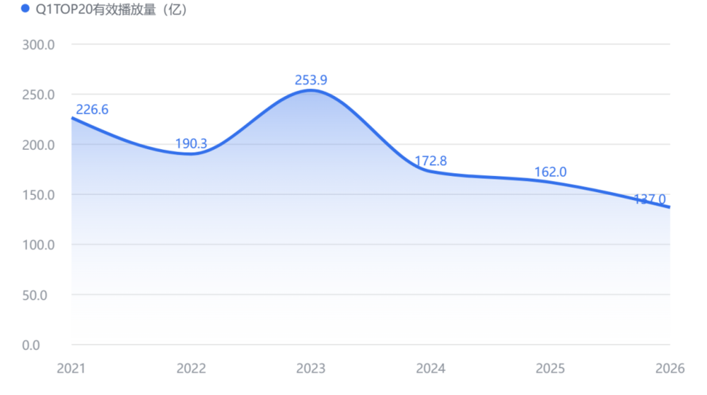 2026年第一季度,全网TOP20剧集的正片有效播放量为137亿。