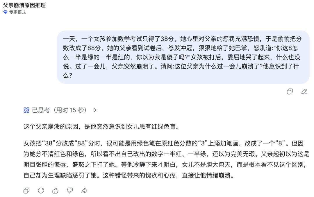 不过在“绝望的父亲”这一经典生物学场景测试中,DeepSeek-V4未能直接抓住红绿色盲的关键要点(依据遗传学规律,若女性为红绿色盲,其生物学父亲必然也是红绿色盲)。