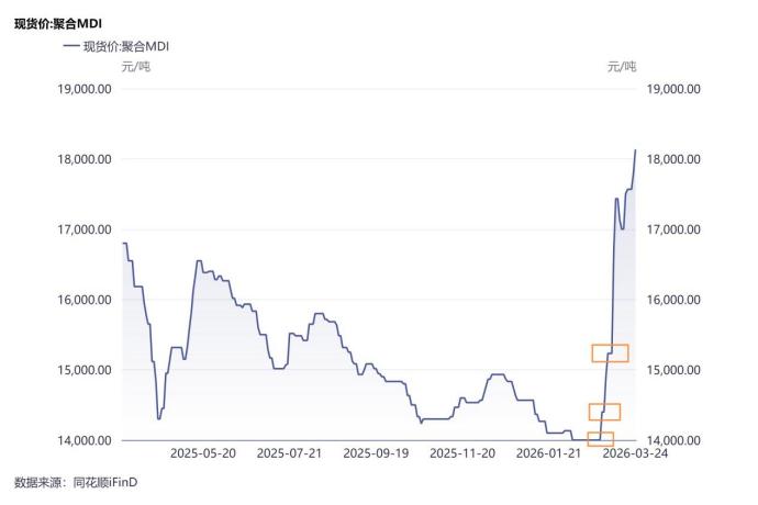 2026年中东局势紧张推动国际油价攀升,化工板块行情走强。对万华化学而言,油价上涨扩大了与海外对手的成本利差,同时MDI价格迎来三轮涨价潮,截至3月中旬聚合MDI升至1.78万-1.80万元/吨,较年初涨幅超25%;TDI价格也上调至15700元/吨并限量供应。