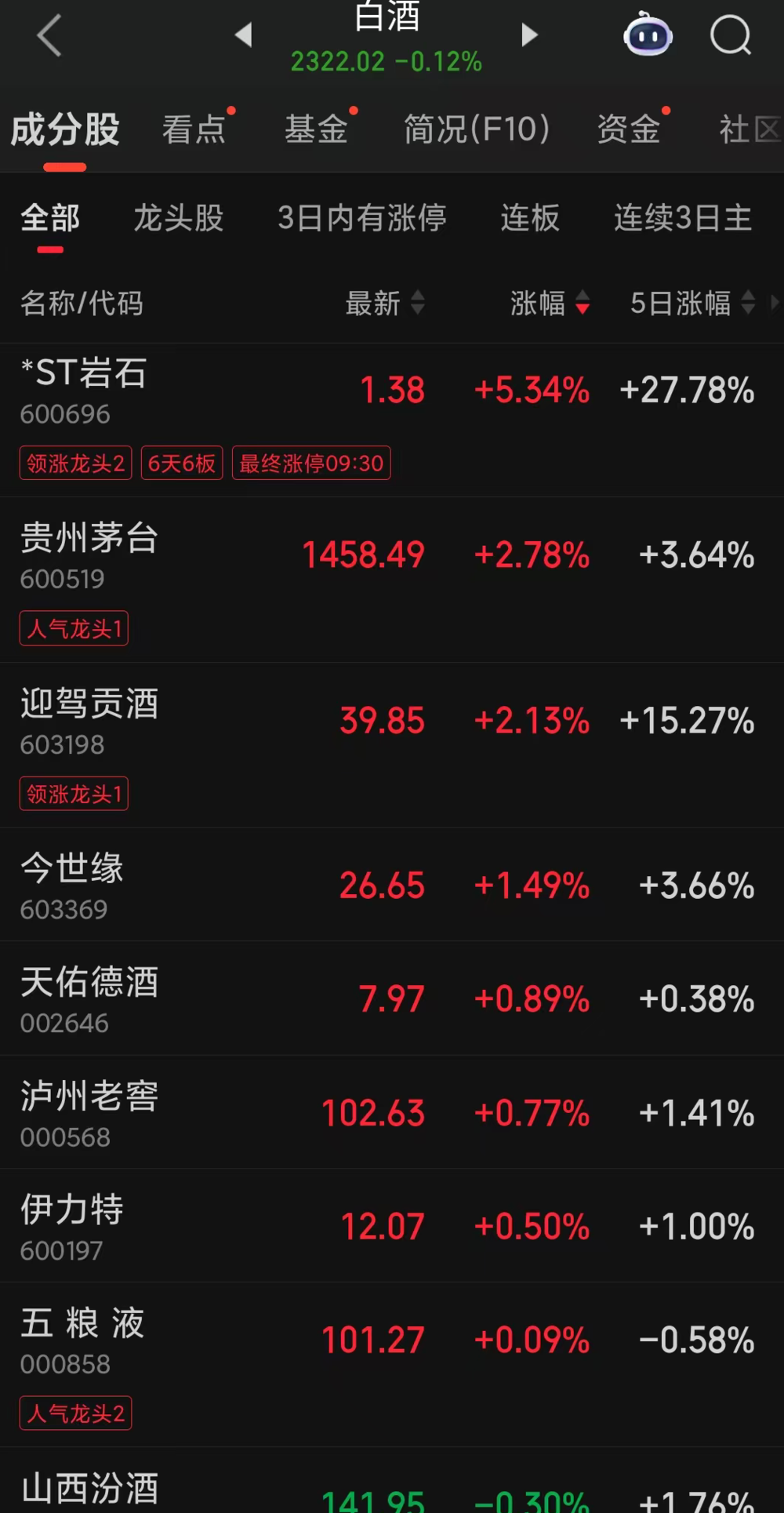 成分股中,除*ST岩石因资金炒作连续两日涨停外,贵州茅台表现突出,涨幅约2.78%,报1458.49元/股,这或与市场对其一季报的预期有关;迎驾贡酒继前一日涨停后继续上涨,收盘39.85元/股,涨幅2.13%,五粮液、泸州老窖等5只个股也呈上涨态势。