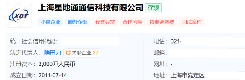 天眼查显示,上海星地通成立于2011年7月,注册资本3000万元,法定代表人及实际控制人均为隋田力(持股90%)。