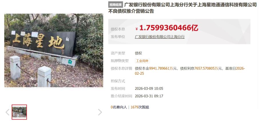 此前,广发银行上海分行曾于2026年3月9日在京东资产交易平台推介该债权,披露贷款以上海嘉定区新冠路科研设计用地房产(建筑面积16042.30㎡,空置)抵押,隋田力承担连带保证责任。虽有1679次围观,但无竞拍者报名。