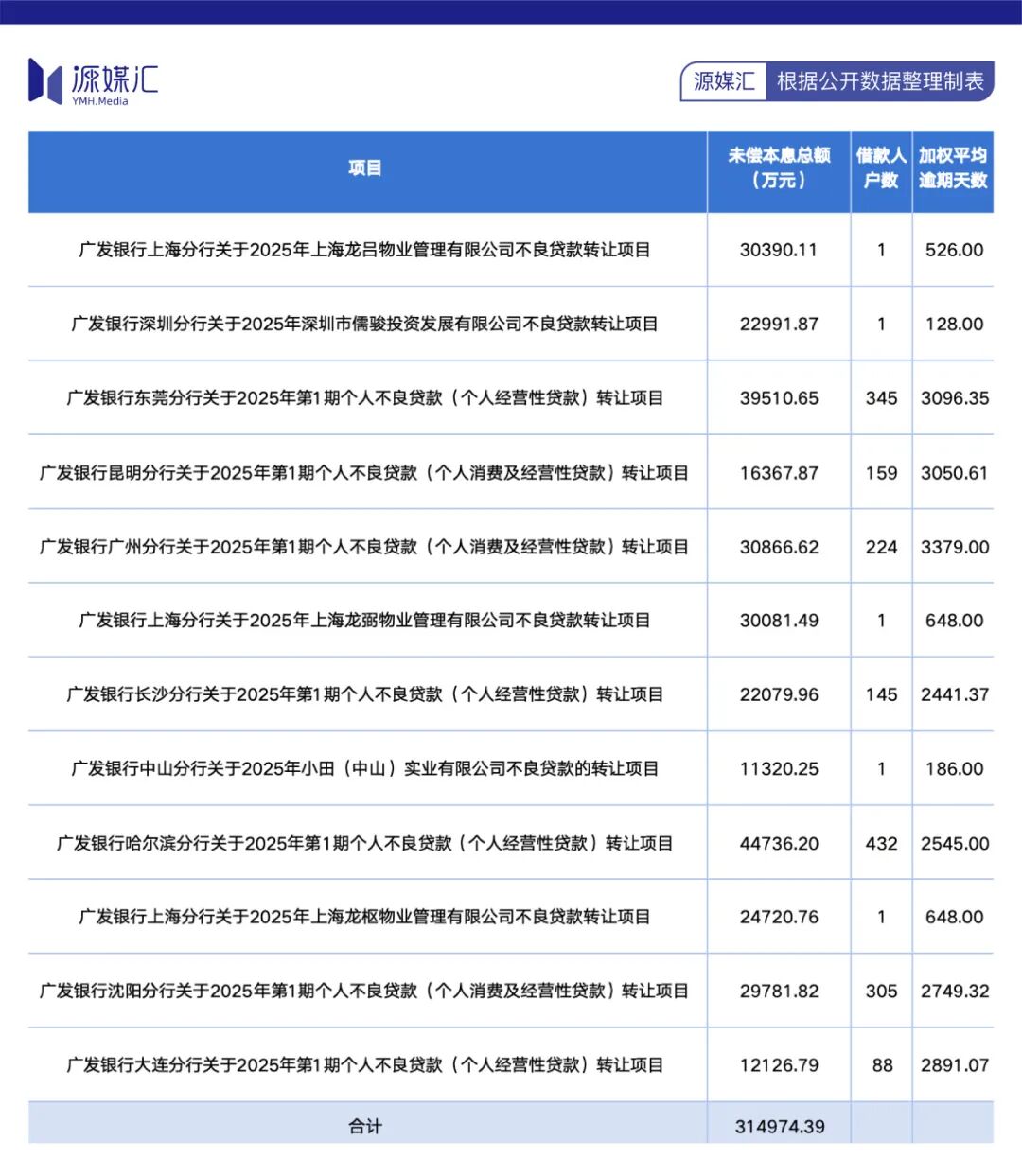 上海星地通并非广发银行唯一不良债权。2025年,广发银行深圳、东莞、广州等多家分行披露多期不良贷款转让项目,合计未偿本息约31.5亿元,涵盖个人及公司贷款。