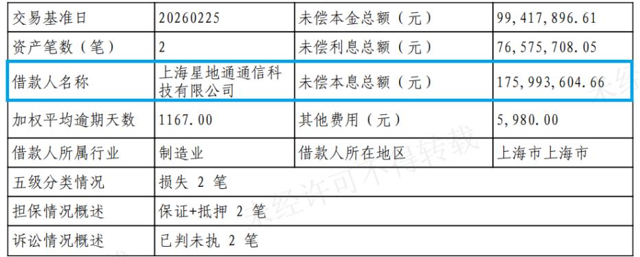 近日,广发银行上海分行在银登网披露“2026年上海星地通通信科技有限公司不良贷款转让项目”,未偿本息约1.76亿元,逾期超3年。上海星地通正是5年前900亿“专网通信骗局”的重要参与者,实际控制人隋田力早已失联。