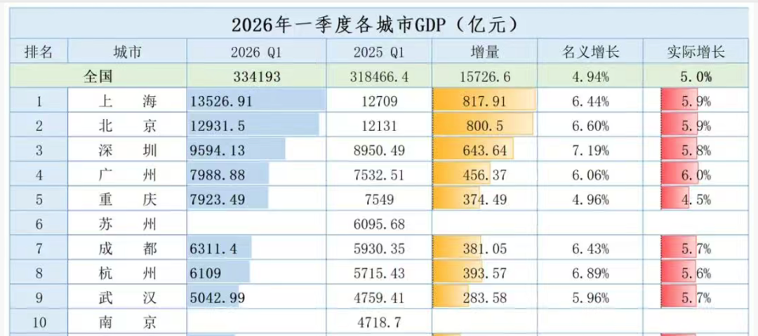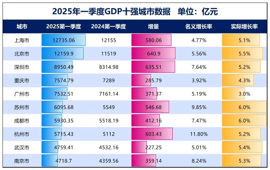 今年一季度十强城市增速普遍跑赢全国,这一情况具有特殊性。对比2024年一季度,全国GDP增速5.3%,十强城市中仅深圳、重庆、苏州、成都4座超过全国水平,占比40%;2025年一季度全国增速5.4%,十强中北京、苏州、成都、武汉4座达标,占比同样40%。而今年已公布数据的8座城市里,仅重庆增速略低于全国(低0.5个百分点),其余均高于全国平均,且超出幅度较大。其中广州增速达6%,高出全国1个百分点;杭州增速5.6%,高出0.6个百分点。从名义增速看,8座城市均高于全国平均。尚未公布数据的苏州、南京,作为江苏经济龙头,结合江苏省一季度5.4%的增速,表现大概率也较为可观。排名方面,广州反超重庆约60亿元,重回GDP“第四城”,这两座城市恰好是目前十强中增速最高和最低的代表。