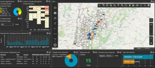 在此基础上,定制化地理空间门户得以建立。该门户以M.App Enterprise智慧地图云平台为核心,整合Luciad数字孪生引擎的先进3D功能,开发出“SI Rio Bogota”河流管理系统、“PESCAR”环境评估平台等专业分析仪表板,实现空气、水质、生物多样性、土地利用等关键环境指标的集中监测与可视化分析。