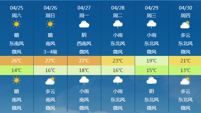 本周末气温偏高,最高气温27℃,出门记得做好防晒。